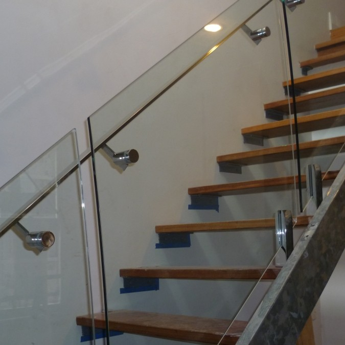 Vertical steel spindles, horizontal rails, glass panels.